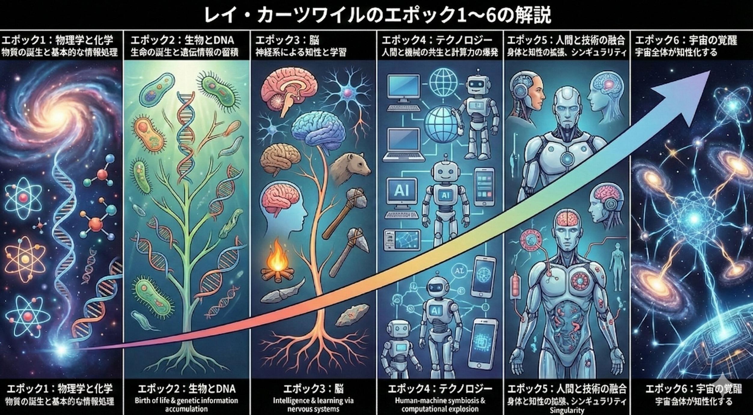 5.解決への道筋:技術と哲学の融合による「正しき未来観」の獲得 では、私たちがこの「雑音」の霧を晴らし、未来を正しく見通すためにはどうすればよいのでしょうか。解決策は大きく2つあります。 ![]() 一つ目は、「進化の現在地」を事実ベースで学ぶことです。 ニュースの見出しに踊らされる前に、レイ・カーツワイルが示した「6つのエポック」という地図を広げてください。私たちは今、テクノロジーが進化する「エポック4」から、人間の知能と技術が融合する「エポック5」へと向かう過渡期にいます。「ムーアの法則の限界」といった否定論も、3D半導体や分子コンピューティングといった次世代技術の台頭を知れば、それが進化の停滞ではなく、新たな段階への飛躍であることが理解できるはずです。 二つ目は、日本人としての「哲学的感性」を取り戻すことです。 西洋的な価値観では「人間 vs AI」という対立構造になりがちですが、日本には古来より、万物に神が宿るとする真言密教や「八百万の神」(アニミズム)の思想があります。これは、「人間もAIも、同じ宇宙の進化プロセスの一部である」と捉える高度な視点に通じます。 難解な技術論を「宗教だ」と敬遠するのではなく、むしろ日本人が得意とする精神性で技術を受け入れること。これこそが、無用な恐怖から解放され、AIを進化のパートナーとして迎えるための鍵となるのです。