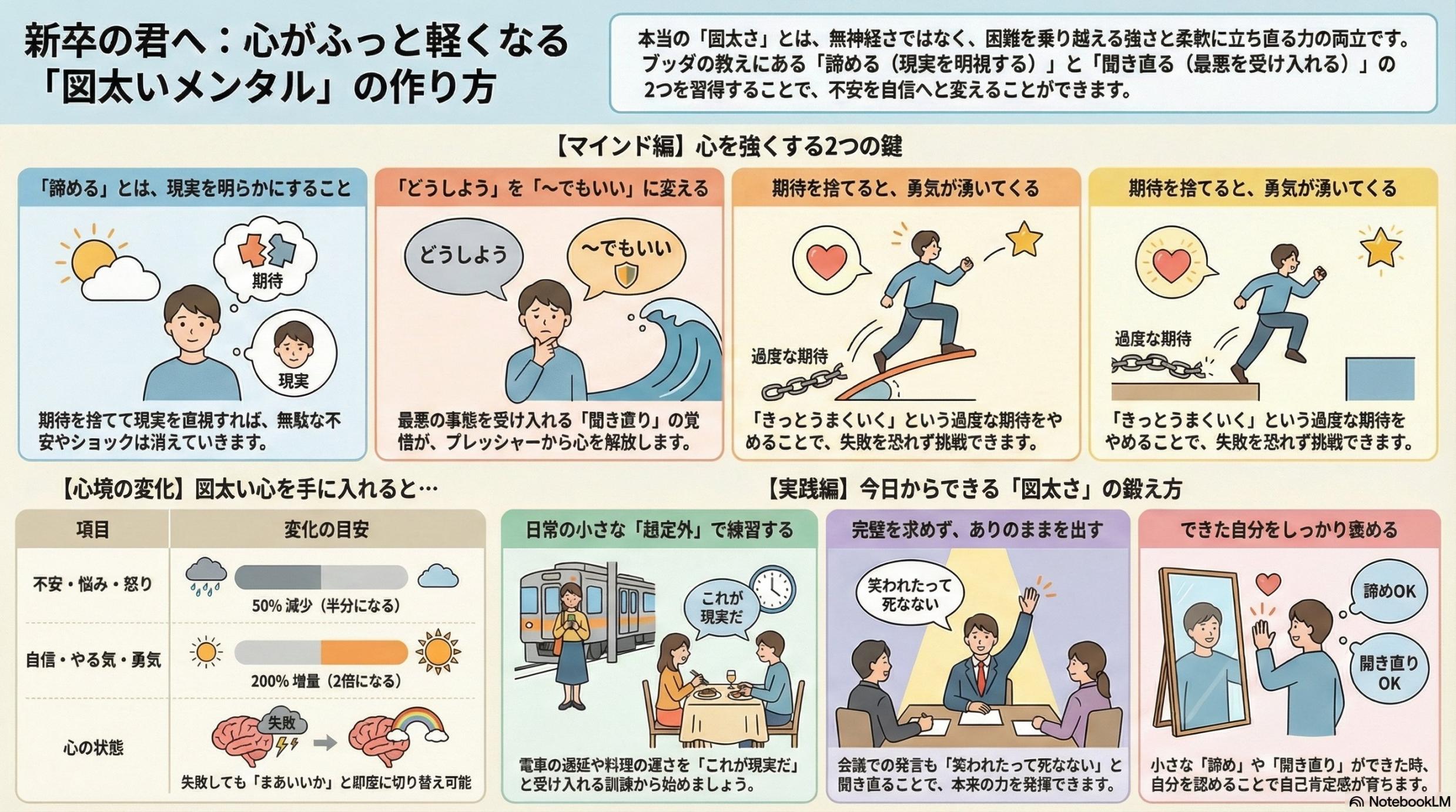 3.仏教の知恵と現代心理学が証明する「精神の合理性」 今回ご紹介する「図太い心」の構築方法は、単なる精神論ではありません。その土台には、二千五百年以上の歴史を持つ仏教の知恵と、現代のレジリエンス(回復力)心理学という、非常に合理的な裏付けがあります。 仏教において、苦しみから解放されるための第一歩は「あるがままの現実を受け入れること」にあります。これは現代心理学でいうところの「マインドフルネス」や「受容」の概念と深く一致しています。事実を捻じ曲げず、自分の感情を客観的に観察するスキルを磨くことで、私たちは不必要なダメージを回避できるのです。 また、心理学の研究データによれば、失敗を過度に恐れる人よりも、「失敗してもいい」と開き直っている人の方が、プレッシャー下で本来のパフォーマンスを発揮しやすく、結果的に成功確率が高まることが示されています。 歴史を見ても、WBC決勝という極限の場面で「開き直って楽しもう」と切り替えたイチロー選手や 、「我なすことは我のみぞ知る」と他人の評価を断ち切った坂本龍馬のように 、大きな成果を出す人は共通して、この後天的に獲得可能な「図太いスキル」を使いこなしています。