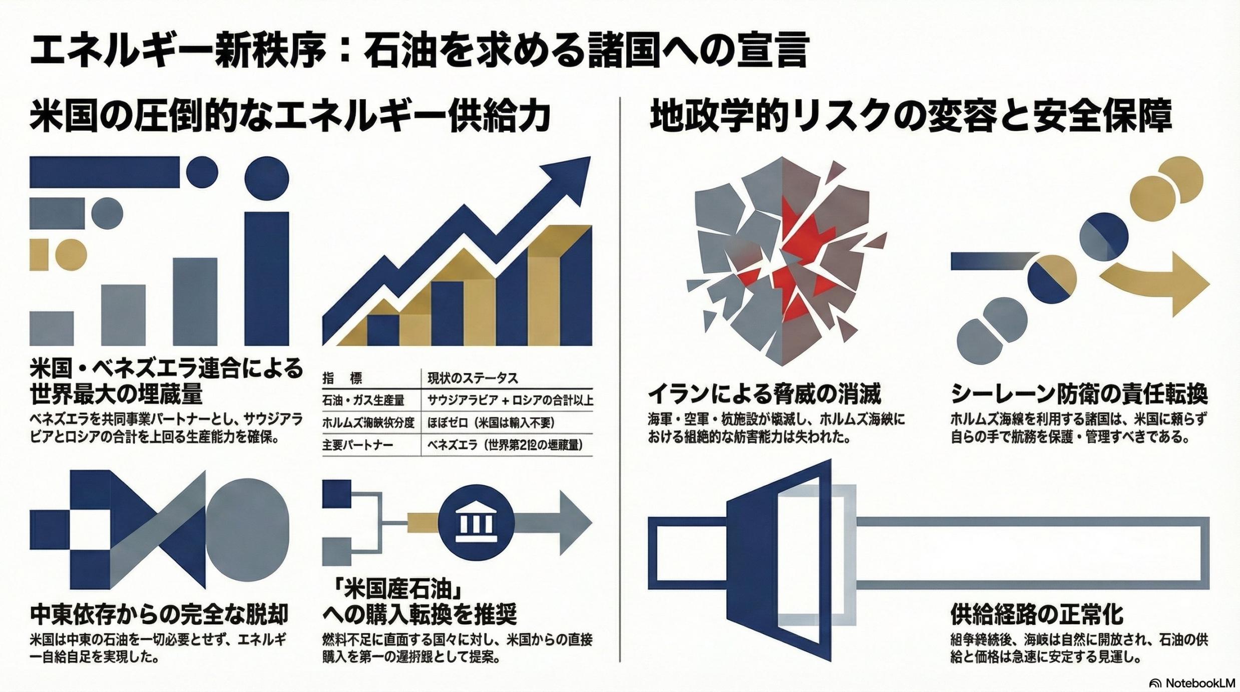 4.エネルギー独立とホルムズ海峡の「冷徹な真実」 トランプ大統領がこれほどまでに強気な最後通牒を突きつけられる最大の要因は、アメリカが成し遂げた「完全なエネルギー独立」という圧倒的な事実にあります。かつてのアメリカは中東の石油に依存せざるを得ない体質でしたが、その構造は今、劇的な転換を迎えました。 あなたが注目すべき数値は、アメリカの石油・ガス生産量です。ベネズエラを制圧し「ジョイント・ベンチャー」として資源開発を強化した結果、現在のアメリカはサウジアラビアとロシアの合計を上回る生産量を実現しています。この圧倒的な供給能力こそが、中東情勢に左右されない「自由」をアメリカにもたらしたのです。 この変化は、世界の安全保障のあり方を根底から変える「冷徹な真実」を浮き彫りにしました。それは、世界の原油輸送の要所であるホルムズ海峡に関する大統領の踏み込んだ発言に集約されています。