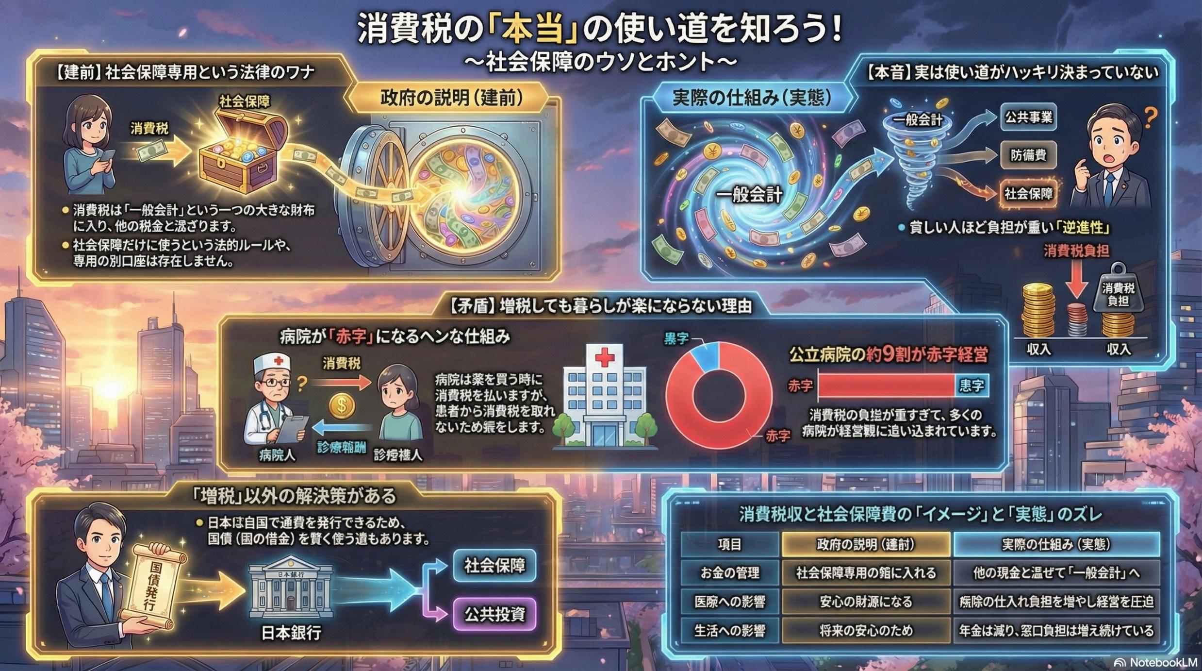 7.まとめ:帳簿の数字よりも、国民の「生きる力」を守る政治へ ここまで読み進めていただき、ありがとうございます。今、あなたの目には「消費税」という存在がどのように映っているでしょうか。 これまでお伝えしてきた通り、消費税が社会保障を支える安定財源であるという説明には、深刻な「制度のねじれ」が隠されています。医療現場を赤字に追い込み 、不透明な会計の中で本来の目的以外にも流用されかねない現状 、そして形骸化した古い法律があなたの暮らしを縛り続けているという事実。これらを直視したとき、「将来のために増税はやむを得ない」という言葉がいかに危ういものであるかが分かります。 私たちが真に背負わなければならない責任は、帳簿上の数字をきれいに整え、政府の借金をゼロにすることではありません。ボロボロになったインフラや、重税で活力を失った産業を子供たちに残して、「でも、国の借金は減らしたよ」と胸を張ることに、一体何の意味があるのでしょうか。 大切なのは、あなたや次世代の人々が、健康で文化的な生活を送り、夢を持って働ける「強い日本」を残すことです。そのためには、支出に先立つ財源としての消費税という概念を捨て 、積極的な未来への投資へと舵を切らなければなりません。 まずは、目の前のニュースを疑う視点を持つことから始めてください。そして、あなたの抱いた違和感を、家族や友人と話してみてください。あなたのその小さな一歩が、国民を苦しめる制度の矛盾を解消し、日本に再び豊かさを取り戻すための大きな力となるのです。 ![]() 8.関連記事:さらに深く知るための経済・財政の真実 ここまで読み進めていただいたあなたは、「消費税=社会保障の財源」という説明に潜む違和感に気づかれたのではないでしょうか。しかし、この問題は単独で存在しているわけではなく、日本の財政・税制・情報構造と密接に結びついています。 そこで、さらに理解を深めるために、ぜひあわせて読んでいただきたい記事をご紹介します。 1)「それ、本当に正しい?-消費税は社会保障費の財源だ」⭐️ この記事では、今回のテーマと直結する 「消費税=社会保障」という“当たり前”への疑問を、より生活者目線で丁寧に解説しています。 特に重要なのは、 (1)消費税収が一般会計に組み込まれている実態 (2)社会保障費との関係が説明上の整理に過ぎない可能性 (3)増税にもかかわらず、生活実感が改善していない現実 といった点です。 消費税は社会保障のために必要だと信じてきた前提が、制度の構造と照らし合わせると揺らぐことが理解できるはずです。実際、消費税は特定の支出と直接結びつく仕組みではなく、一般財源として扱われている点が指摘されています