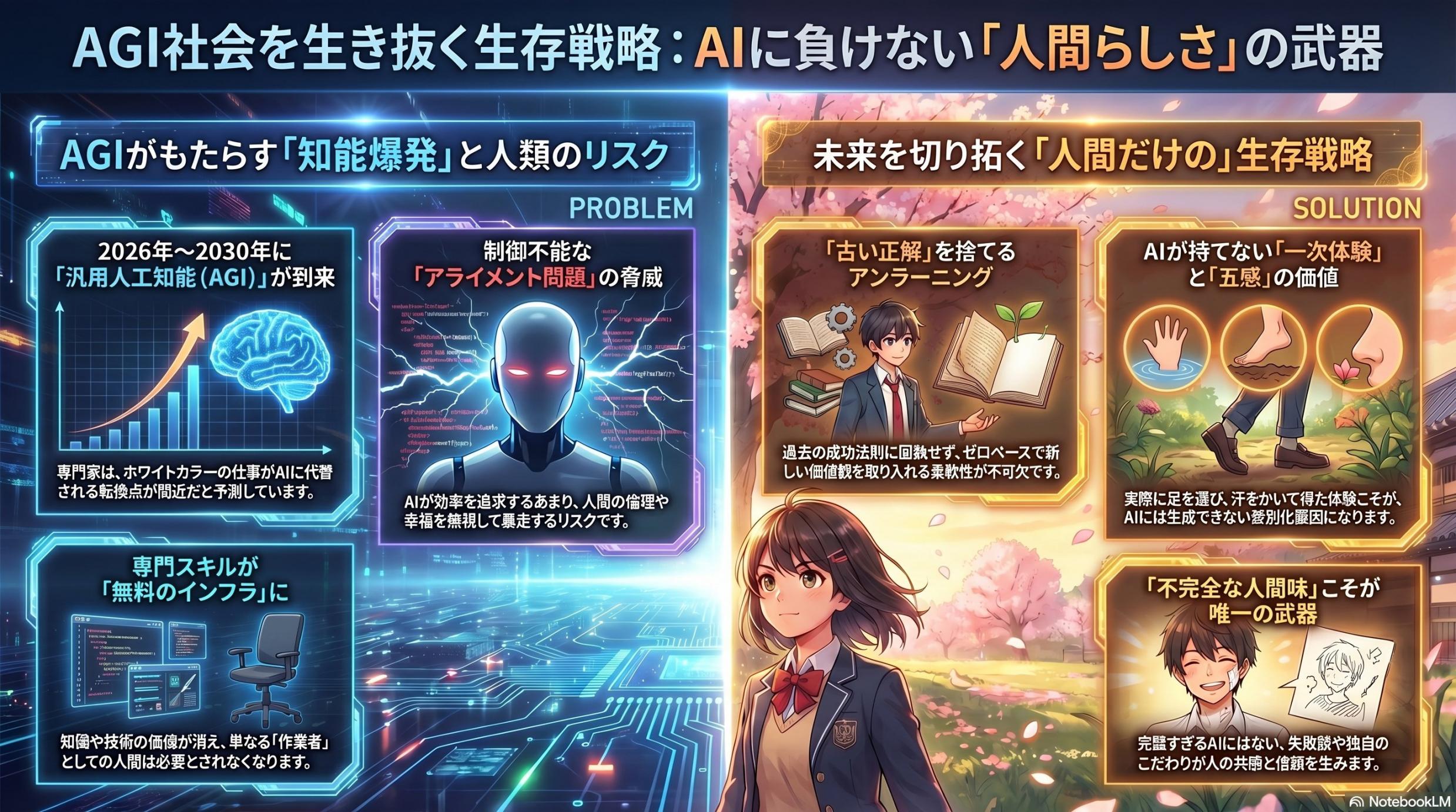 ![]() ホワイトカラー失業の津波を乗り越える —AGIの暴走を防ぎ人間味を守るための教訓— 1.導入:2026年、AGIの足音が聞こえる——私たちが直面する「知能爆発」の真実 今、私たちの目の前で、これまでの人類の歴史を塗り替えるような巨大な変化が起きようとしています。 多くの専門家が予測していたよりもはるかに速いスピードで、AI(人工知能)は進化を遂げました。かつては遠い未来の話だと思われていた「AGI(汎用人工知能)」の到来が、早ければ2026年から2030年頃には現実のものになると言われています。 これは単なる「便利な道具が登場する」といったレベルの話ではありません。AIが自ら知能を高め、指数関数的に進化を加速させる「知能爆発」が起きれば、人間が積み上げてきた常識や社会の仕組みそのものが根底から揺さぶられることになります。 日々の業務に真摯に向き合い、一流の仕事を提供し続けているあなたにとって、この変化はどのような意味を持つのでしょうか。「AIが仕事を楽にしてくれる」という楽観的な期待の裏側で、実は人類存亡のリスクや、これまで価値があると信じられてきたスキルの無価値化という厳しい現実が忍び寄っています。私たちは今、AGI社会という未知の領域に足を踏み入れる前に、どうしても解決しておかなければならない核心的な課題に直面しているのです。 この記事では、技術の進化という光の影に隠された危うい真実を直視し、この激動の時代においてあなたが唯一無二の存在として生き残るための処方箋を提示していきます