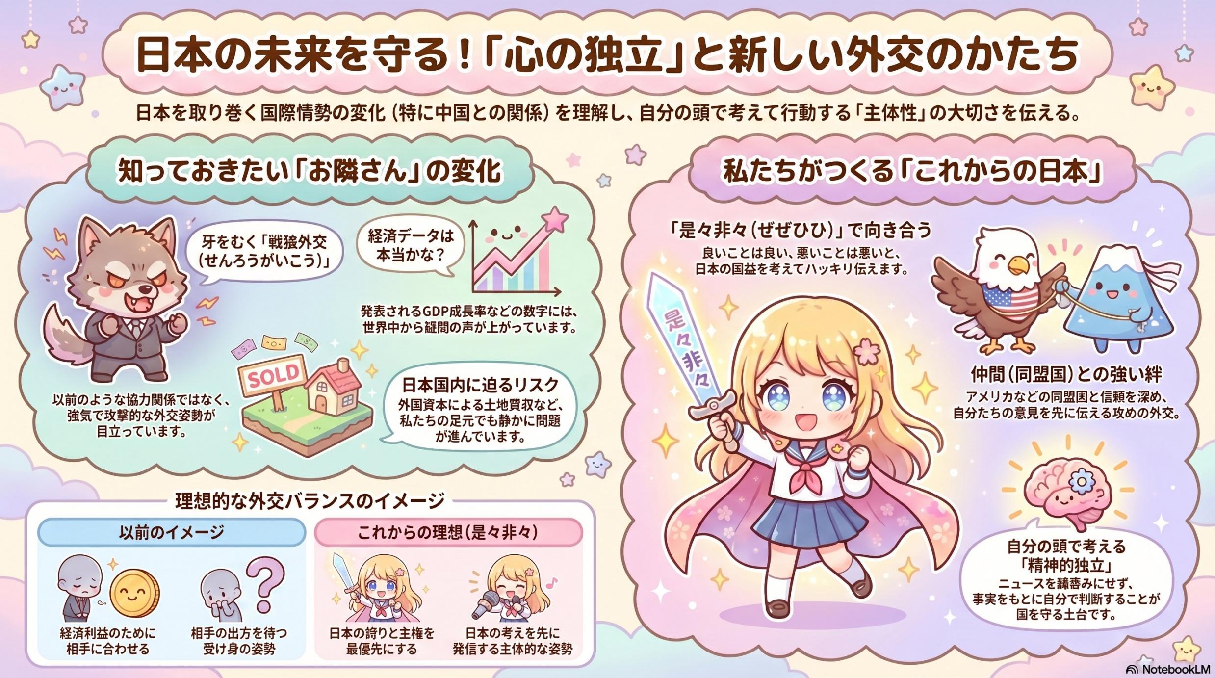 7.まとめ:日本が日本であり続けるために、今こそ精神的独立を ここまで読み進めてきたあなたは、日本が直面している課題が、単なる遠い国の外交問題や軍事バランスの話ではないことに気づかれたはずです。本質は、日本が「独立した国家として考え、判断し、行動できているのか」という根源的な問いにあります。 戦後、日本は経済的な復興を果たし、形式上は主権国家として国際社会に復帰しました。しかしその一方で、歴史観や価値観の領域では、特定の枠組みから完全に自由になれない状態が続いてきました。この歪みは、外交や安全保障の議論において、無意識のブレーキとして今も私たちの判断に影響を及ぼしています。 現代の日本に求められているのは、感情的な対立ではなく、理論と事実に基づいた主体的な思考です。現状の中国が日本に対して明確な敵意と威圧を繰り出している以上、経済的な利益のために主権や安全保障を犠牲にする姿勢は、もはや許される段階ではありません。 日本が再び世界の中で役割を取り戻すために必要なのは、特別な英雄ではありません。あなた一人ひとりが精神的な独立を回復し、誇りと冷静さを併せ持って自分の頭で考えること。その積み重ねこそが、国家の独立を支える最も強固な基盤になります。 歴史は過去を縛る鎖ではなく、未来を照らす羅針盤です。あなたが今日、このテーマについて考えたこと自体が、すでに日本の未来を選び取る大切な一歩なのです。