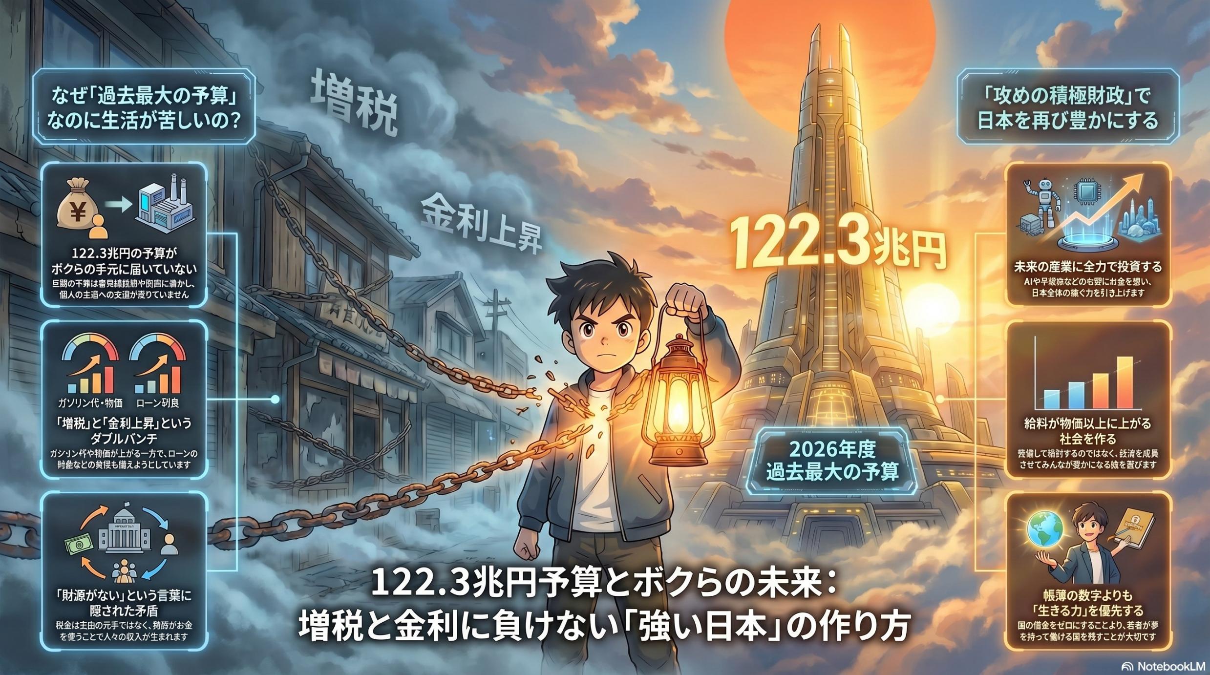 7.まとめ:帳簿の数字よりも、国民の「生きる力」を守る政治へ ここまで読み進めていただき、ありがとうございます。今、あなたの目には「2026年度予算」という存在がどのように映っているでしょうか。 これまでお伝えしてきた通り、過去最大規模の予算が成立した一方で、増税による「財源の枯渇」や金利上昇という「市場の逆風」という二重苦が、あなたの暮らしを縛り続けています。片山財務大臣が語るように「いい方向に持っていく議論」が期待される一方で、現実の数字が示す財政の硬直化は、もはや精神論では解決できない段階に達しています。 私たちが真に背負わなければならない責任は、帳簿上の数字をきれいに整え、政府の借金をゼロにすることではありません。重税で活力を失った産業や、疲弊した地域経済を子供たちに残して、「国の借金は減らしたよ」と胸を張ることに、一体何の意味があるのでしょうか。 大切なのは、あなたや次世代の人々が、健康で文化的な生活を送り、夢を持って働ける「強い日本」を残すことです。そのためには、支出に先立つ財源としての税という概念を捨て、積極的な未来への投資へと舵を切らなければなりません。 まずは、目の前のニュースを疑う視点を持つことから始めてください。そして、あなたが抱いた違和感を、家族や友人と話してみてください。あなたのその小さな一歩が、国民を苦しめる制度の矛盾を解消し、日本に再び豊かさを取り戻すための大きな力となるのです。 ![]()