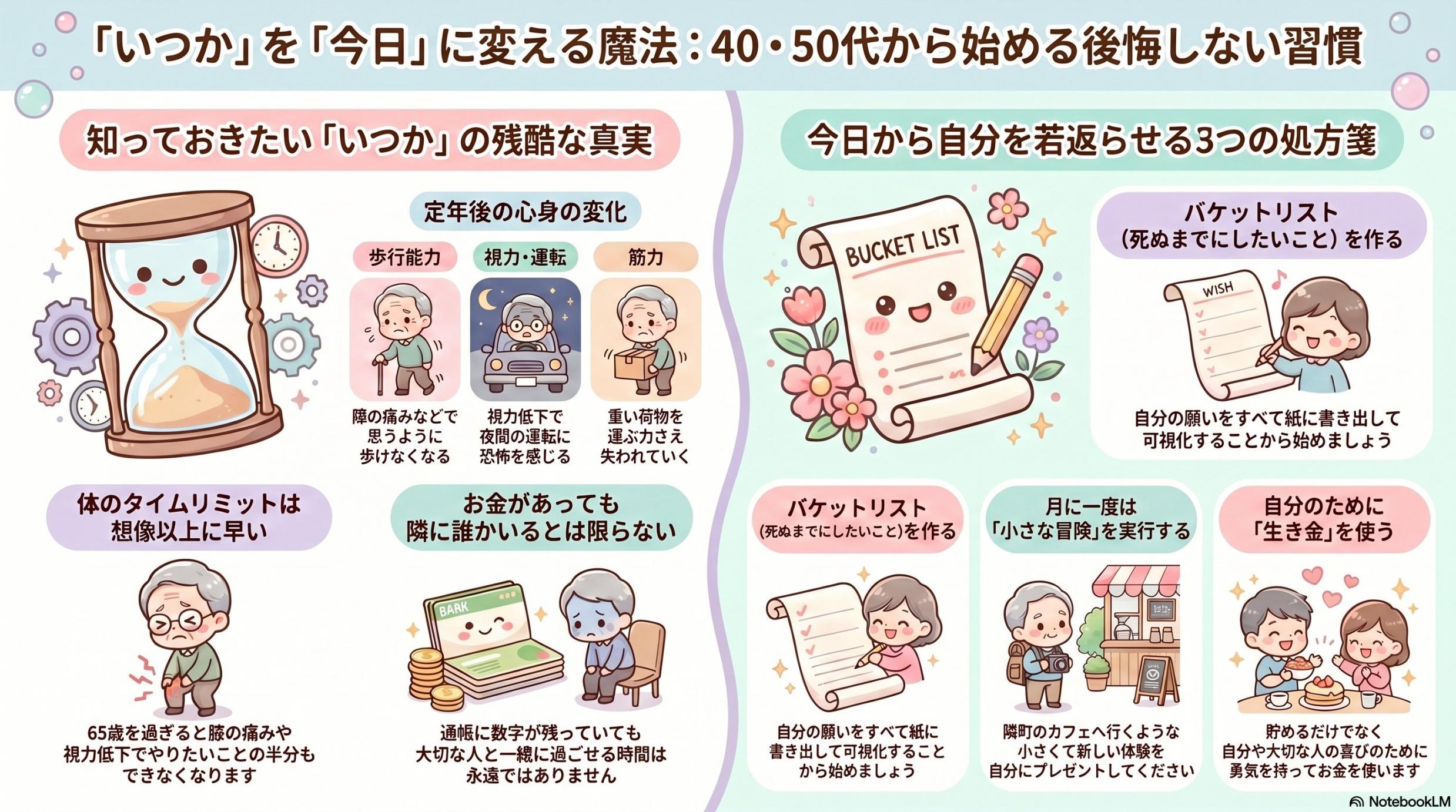 ![]() 「いつか」が招く残酷な結末 ー60代から始める、後悔しないための「今日」の過ごし方1.導入:動けるうちに「やりたいこと」をしていますか? 「いつか時間ができたら、あそこへ旅行に行こう」 「いつか余裕ができたら、あの趣味を始めてみよう」 これまで一生懸命に働き、家族や周囲のために尽くしてきたあなたは、そんなふうに自分の楽しみを「いつか」という言葉で後回しにしてこなかったでしょうか。実は、この「いつか」という言葉こそが、人生において最も注意すべき先延ばしかもしれません。私たちは、時間や体力が永遠に続くかのように錯覚してしまいがちですが、実際には「やりたいことができる時間」には明確な期限があります。特に、人生の円熟期を迎える60代という時期は、これまでの経験を活かして人生を謳歌できる黄金期であると同時に、心身の変化を無視できない重要な節目でもあります。 今回は、ある一人の男性(仮称:雅史さん)が直面した現実を通じ、後悔しないために今日から何を始めるべきか、その具体的な方法についてお伝えします。人生の主役を自分自身に取り戻すための第一歩を、一緒に踏み出してみましょう。