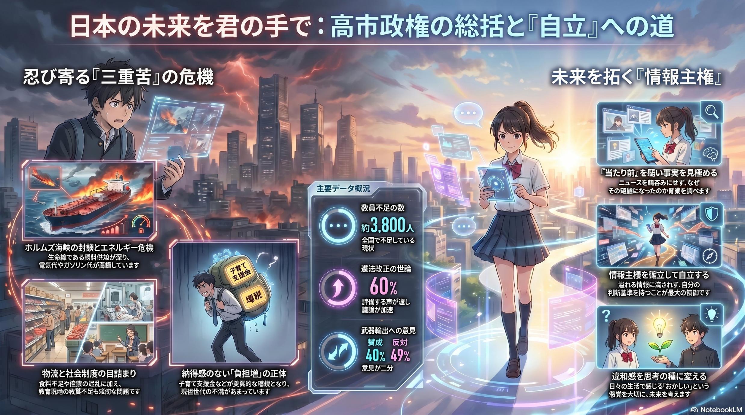 7.まとめ:対岸の火事ではない――未来を自らの手で定義する「覚悟」 高市政権が直面している現在の苦境と、その背後にある構造的な課題は、決して海の向こうや永田町だけの出来事ではありません。このニュースがあなたに示しているのは、世界が「自らの足で立たない者には容赦のない」フェーズに突入したという明白な事実です。 私たちが今日、当たり前のように享受している便利さや安全は、実は非常に脆弱な構造の上に成り立っています。エネルギーの目詰まりや社会保障の歪みは、その脆さが限界に達したサインに他なりません。 今、日本という国、そしてあなた自身が大きな分岐点に立っています。