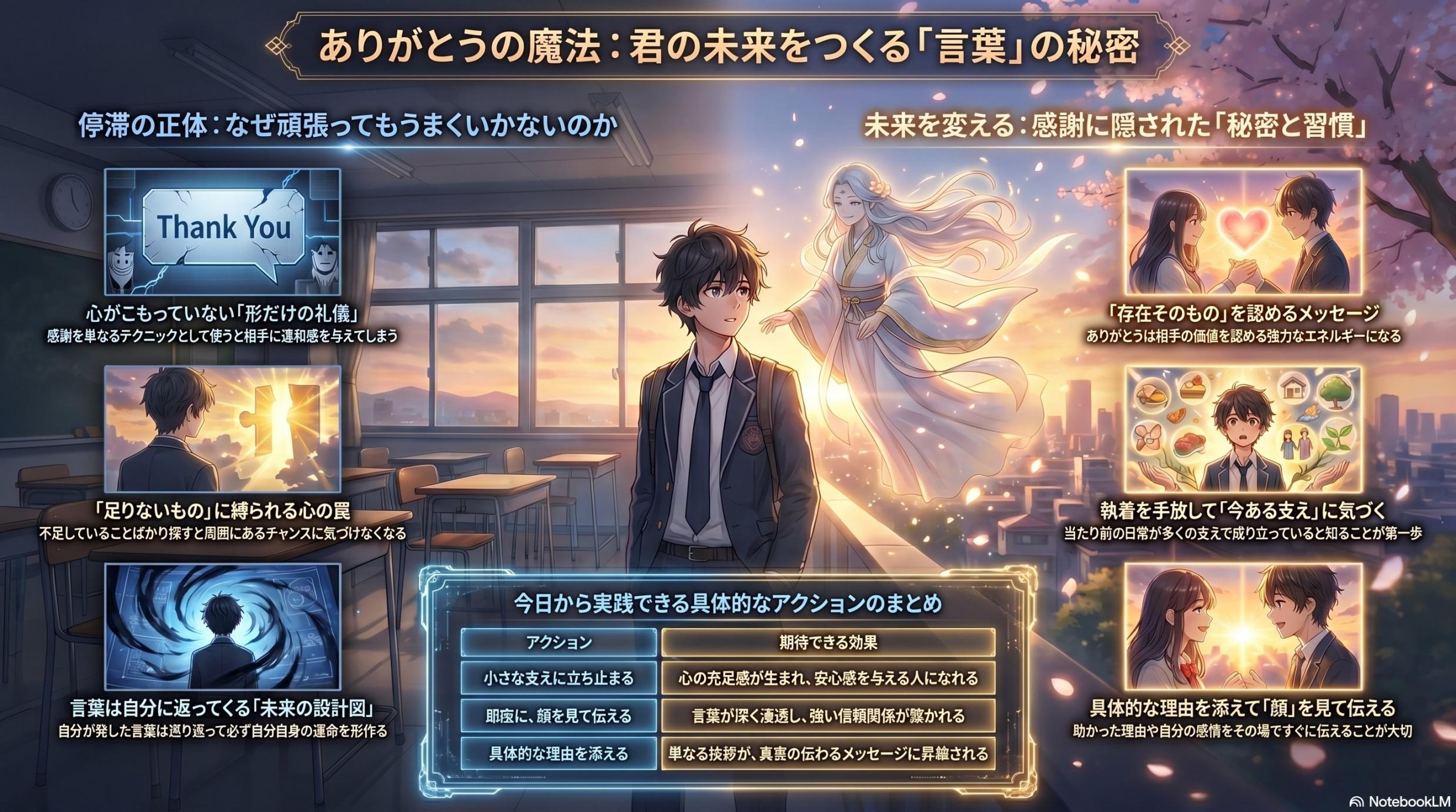 7.まとめ:言葉の刃を磨き、独立自尊の道を歩む 私たちの人生は、これまで発してきた言葉の積み重ねによって形作られています。しかし、それ以上に、どのような「在り方」でその言葉を放ってきたかが、あなたの品格と事業の未来を決定づけます。 本稿で解説した通り、人生が思うようにいかない壁の正体は、能力の不足ではなく、心を通わせない「形だけの礼儀」や、見返りを求める「縁の消費」という無意識の習慣にあります。これらの問題を解決し、良き循環を生み出すための要点は以下の通りです。 1) 存在を承認する 「ありがとう」を通じて、相手の価値をあるがままに認めること。 2) 「足る」を知る 欠乏感ではなく、今ここにある支えや豊かさに目を向けること。 3) 執着を解放する 自分を大きく見せようとするエゴを手放し、純粋な感謝を伝える強さを持つこと。 感謝の一言は、信頼を深め、新しい機会を呼び込むための「循環のスイッチ」です。計算なしに放たれた言葉は、やがて時間をかけて巡り、あなた自身の力だけでは到達できなかった高みへと人生を運んでくれるでしょう。 まずは今日、身近な人が支えてくれている当たり前の事実に立ち止まり、具体的な理由を添えて、顔を見て伝えてみてください。その小さな一歩が、信頼という目に見えない財産を築き、外圧に左右されない強靭で豊かな人生を切り拓く羅針盤となるはずです。 8.関連記事:真の自立と強さを手に入れるために、あわせて読みたい記事 今回の記事で「言葉の力」や「心の在り方」に関心を持たれたあなたに、その本質をさらに深掘りし、ビジネスや人生に活かすための関連記事をご紹介します。 個人の「心の在り方」は、国家レベルでは「独立の精神」に通じます。表面的な情報に流されず、歴史の真実に基づいた「理論武装」という名の真の抑止力をいかに手に入れるか。あなたの思考の軸をより強固にし、大切な日常を守り抜くための具体的な指針を提示しています。 2)260420こっそり若返る習慣_「いつか」を「今日」に変える勇気 感謝を伝えることを「いつか」と先延ばしにしていませんか?動ける時間、言葉を伝えられる時間には限りがあります。「今日が一番若い日」であると自覚し、後悔を行動に変えるための処方箋です。人生の主役を自分自身に取り戻したいと願うあなたに、ぜひ読んでいただきたい一編です。 3)260419 持続可能性を問う_やると決めたことを続ける脳の働き 良い言葉の習慣を「継続」させるための科学的アプローチを解説しています。根性論ではなく、脳の仕組みを正しく理解することで、1%の改善を指数関数的な成果へと繋げる方法を学べます。言葉の変革を一時的なものにせず、一生モノの財産にするためのヒントがここにあります。 これらの記事をあわせて読むことで、あなたの人生と事業をより高いステージへと引き上げるための具体的なイメージが、より鮮明になるはずです。ぜひ、静かな環境でじっくりと読み進めてみてください。