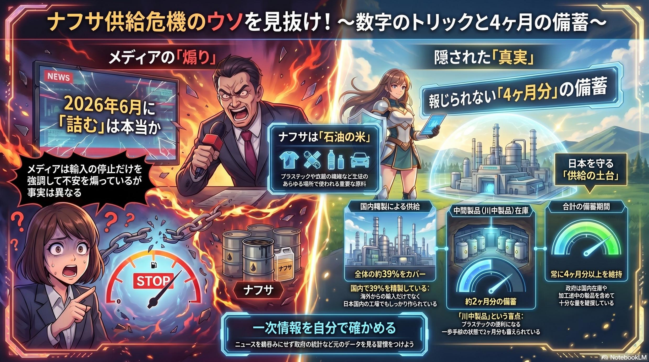 ![]() 【偏向報道の正体】ナフサ供給「詰む」の嘘 ―政府とメディアの数字を暴く— 1.導入:日常を支える「ナフサ」に忍び寄る不穏な影と、私たちが抱いた違和感 日々の暮らしの中で、私たちは無意識のうちに多くの恩恵を享受しています。身の回りにあるプラスチック製品、衣類の繊維、そして物流を支える燃料。そのすべての源流をたどれば、「石油の米」とも呼ばれるナフサ(粗製ガソリン)に行き着きます。このナフサの供給が、もし明日から途絶えるとしたら……。 最近、一部の報道機関が鳴らした警鐘は、まさにこうした私たちの生活基盤を根底から揺さぶるような、極めて衝撃的なものでした。「2026年6月、ナフサの国内供給が完全に詰まる」。そんなショッキングな見出しが躍り、あたかも国家存亡の危機が目前に迫っているかのような空気が醸成されています。 仕事に誇りを持ち、実直に日々の業務に励むあなたであれば、こうしたニュースを目にした際、真っ先に「自らの事業や家族の暮らしにどのような影響が出るのか」と不安を感じたかもしれません。しかし、同時にどこか「座りの悪さ」や「演出された恐怖」のような違和感を抱かなかったでしょうか。 事実を伝えるはずのメディアが、なぜこれほどまでに危機を強調し、特定の解決策へと世論を誘導しようとするのか。その報道の裏側には、私たちが知るべき「もう一つの真実」が隠されています。 本日は、このナフサ供給危機という騒動を切り口に、メディアが巧妙に仕掛ける「数字のトリック」と、私たちがこの複雑な情報社会を生き抜くために必要な「真実を見極める目」について、深く掘り下げていきたいと思います。扇情的な言葉の裏側に潜む意図を、あなたと一緒に解き明かしていきましょう。