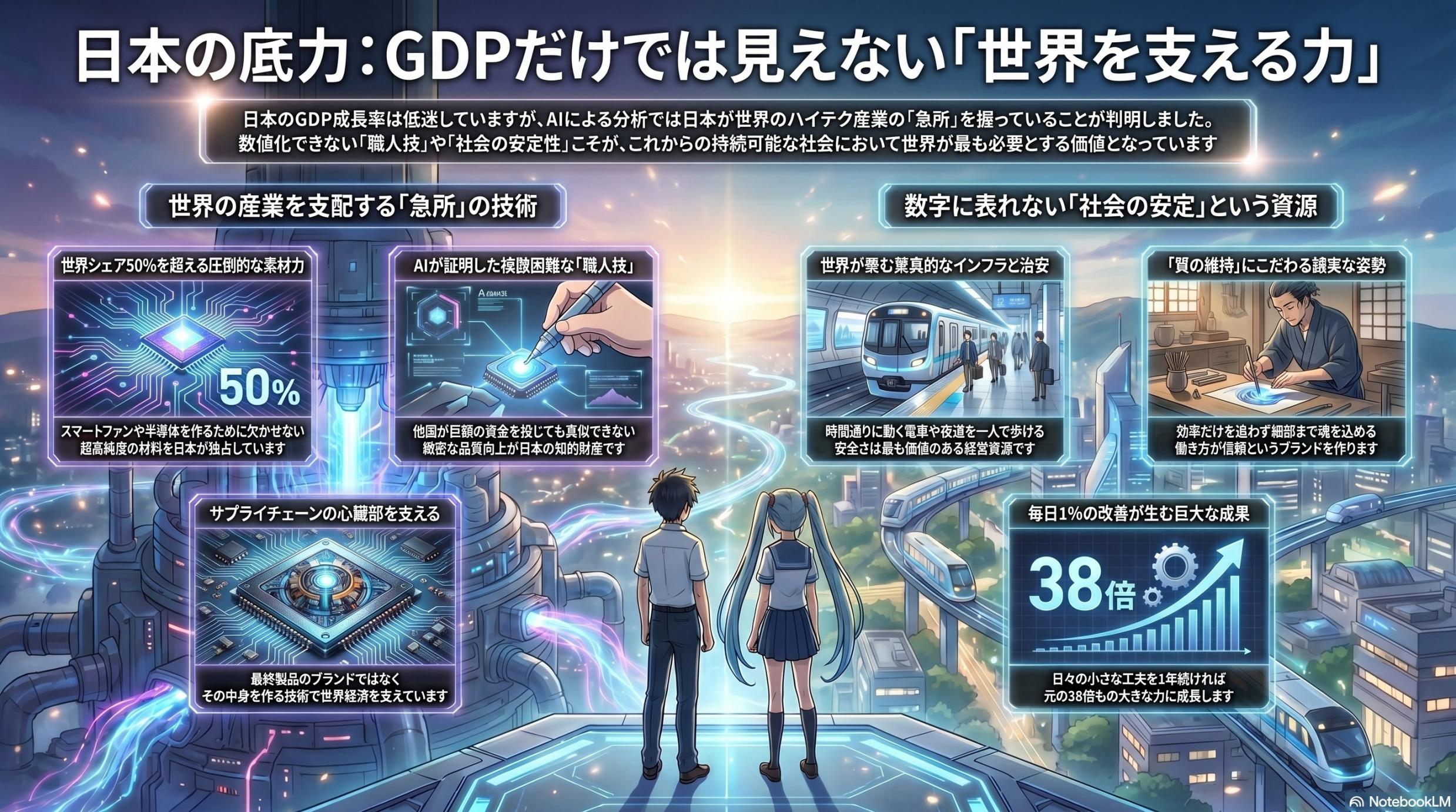 ![]() GDPでは測れない日本の底力 ー世界のエリートが気づき始めた「持続可能性」への転換ー 1.はじめに:世界が「終わった国」と嘲笑した日本の真実 かつてスイスで開催された国際会議の場で、ある経済学者が「日本はもはや終わった国だ」と断言し、会場が失笑に包まれたというエピソードがあります。失われた30年、低迷するGDP、加速する少子高齢化。外側から見える数字や指標だけを切り取れば、確かに日本は活力を失い、停滞の底に沈んでいるように映るかもしれません。 しかし、本当にそうでしょうか。最新のAI解析や、客観的なデータが示す事実は、私たちが日々メディアから受け取っている絶望的な予測とは全く異なる景色を映し出しています。 実は、日本は停滞していたのではなく、「持続可能な社会」への音を立てない進化を、世界に先駆けて進めていただけだったのです。 あなたが毎日、目の前の仕事に真摯に向き合い、「より良いものを」と細部にまで魂を込めるその姿勢こそが、実は今の世界が喉から手が出るほど欲している「真の価値」の源泉です。この記事では、なぜ今、世界のエリートたちがこぞって日本を再評価し始めているのか、そしてあなたが持つ「数値化できない底力」がいかに未来を切り拓く鍵になるのかを解き明かしていきます。 表面的な悲観論に惑わされる必要はありません。日本はもう、目覚めているのです。