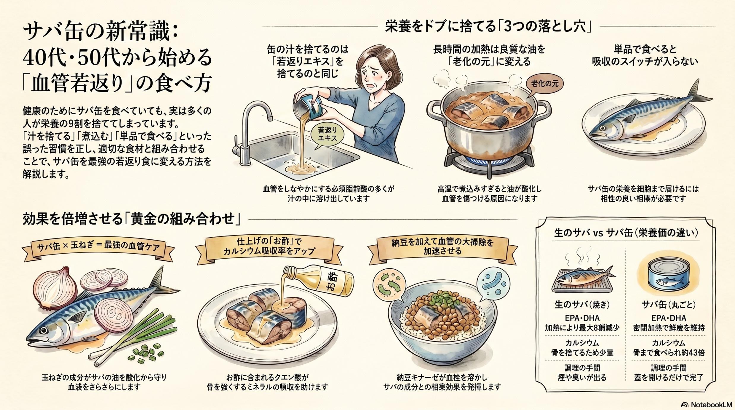 ![]() サバ缶の汁を捨てるな! ー60代からの血管を蘇らせる「最強の相棒」と究極の食べ方ー